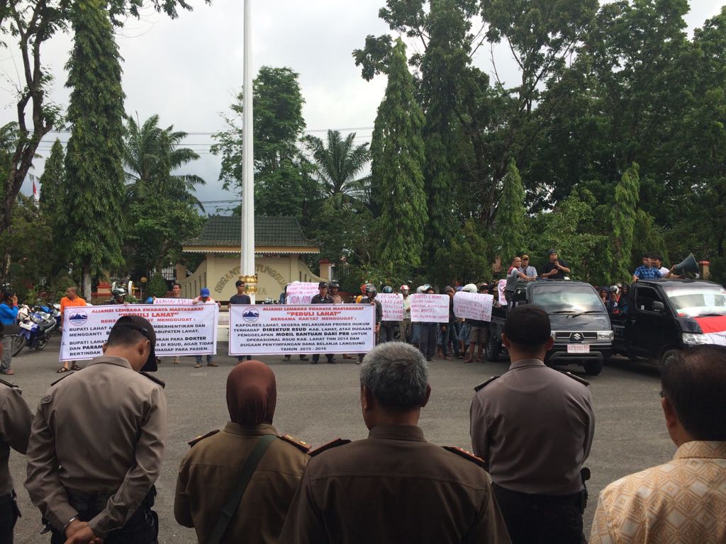 Lahat, beritakite.com – Puluhan Aliansi Lembaga Swadaya Masyarakat (LSM), sekitar pukul 10.00 WIB, Kamis (21/12/2017), melakukan aksi damai, meminta sekaligus mendesak Pemda Lahat, agar jabatan Direktur RSUD Lahat diganti atau diberhentikan.