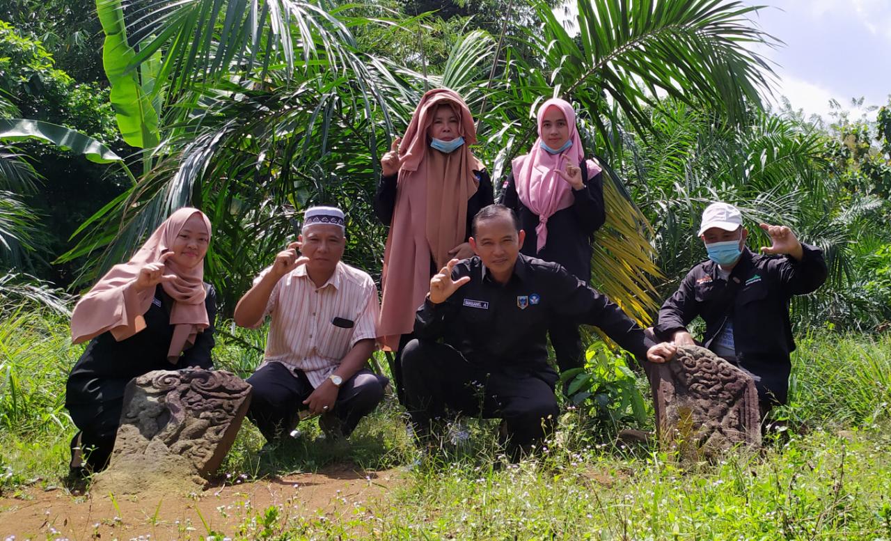“Nah selanjutnya kami menuju 2 nisan kuno berelief yang diceritakan dari awal oleh H. Muhammad Juni. Ketika kami berada di belakang bangunan PAUD kami temukan batu megalit yang kami identifikasi sebagai bakal lumpang batu karena batu datar ini sudah terlihat pahatan sepertinya bakal lumpang batu lalu sekitar 5 meter dari bakal lumpang batu kami temukan lagi nisan batu yang tergeletak,”kata Mario.