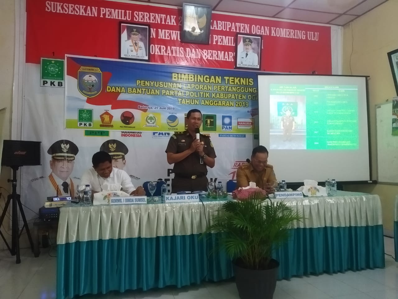 Kepala Kejaksaan Negeri OKU Bayu Pramesti, SH, melalui kasi intel Abu Nawas saat dikonfirmasi beritakite.com terkait tujuan penyampaian materi dalam Bimtek menjelaskan bahwa penyampaian materi dalam bimtek tersebut untuk melalukan penyuluhan hukum dan penerangan hukum kepada partai-partai politik yang berhak menerima bantuan dana hibah dan bansos di Kabupaten OKU karena ada hak dan kewajiban penerima dana bantuan tersebut.