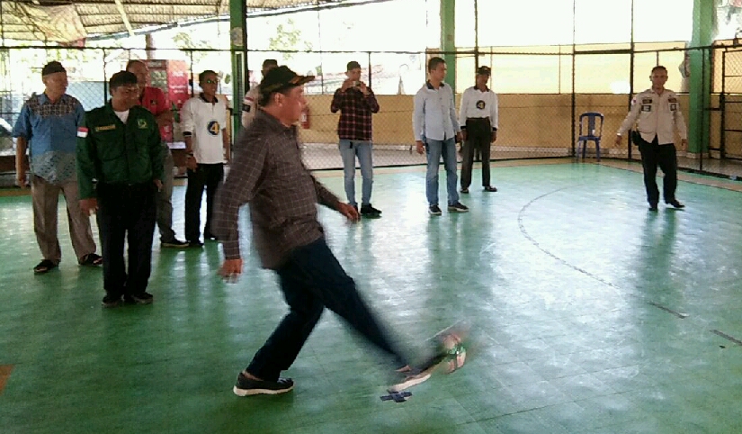 Seusai memberikan arahan, Calon Bupati lahat H. Bursah Zarnubi membuka acara Turnamen Futsal Cup dengan simbol memberikan tendangan Bola ke gawang. (Vinna)