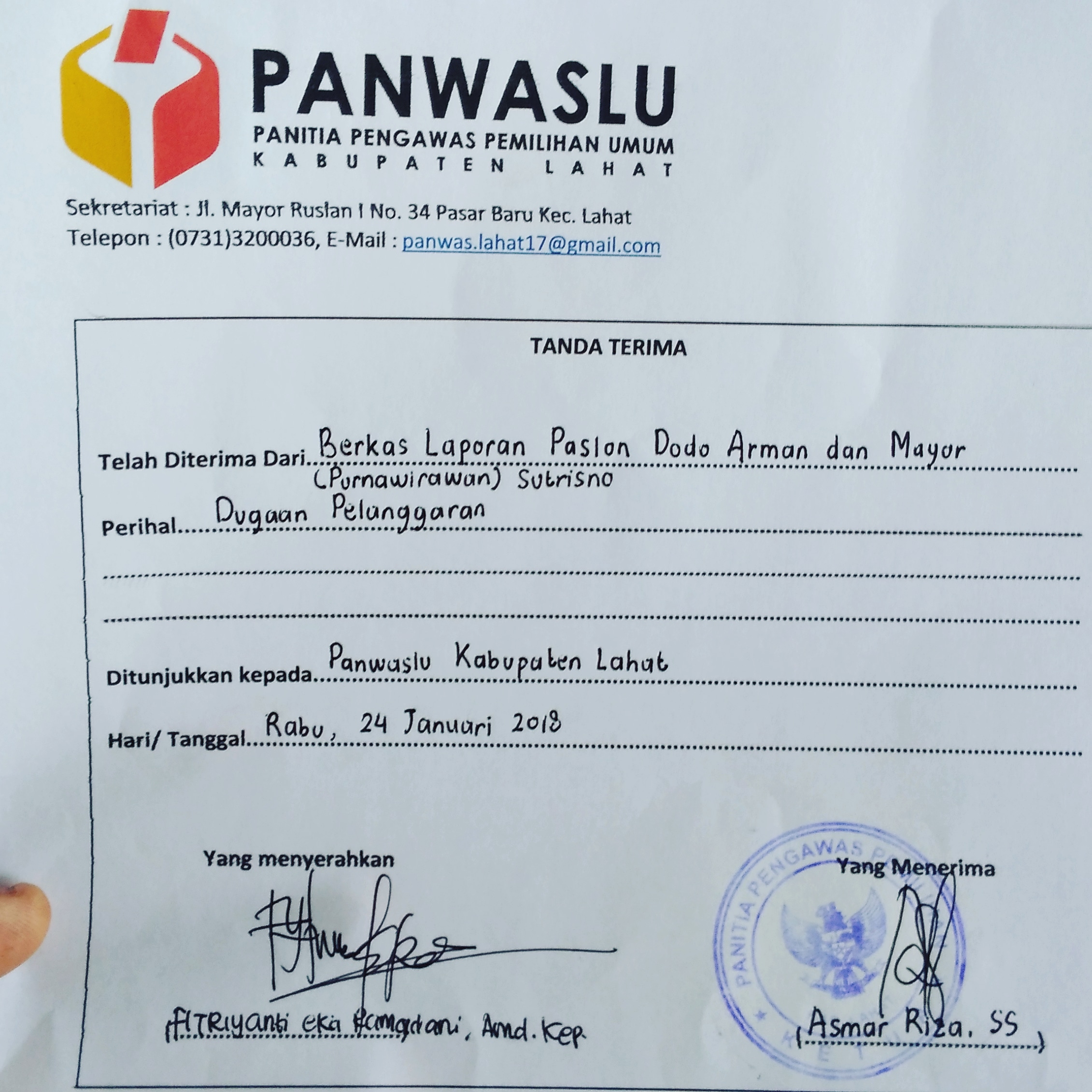 Sementara itu, Sepsata Andrian Ketua Panwaslu Kabupaten Lahat ketika dikonfirmasi menjelaskan bahwa Panwaslu telah menerima berkas dan menerima siapapun yang mengadu. “Karena kami adalah wasit. Kami memperlakukan hal sama untuk seluruh peserta pemilu. Kami juga berusaha memastikan KPU bekerja sesuai tahapan dalam PKPU yang dibuatnya ,”jelasnya.