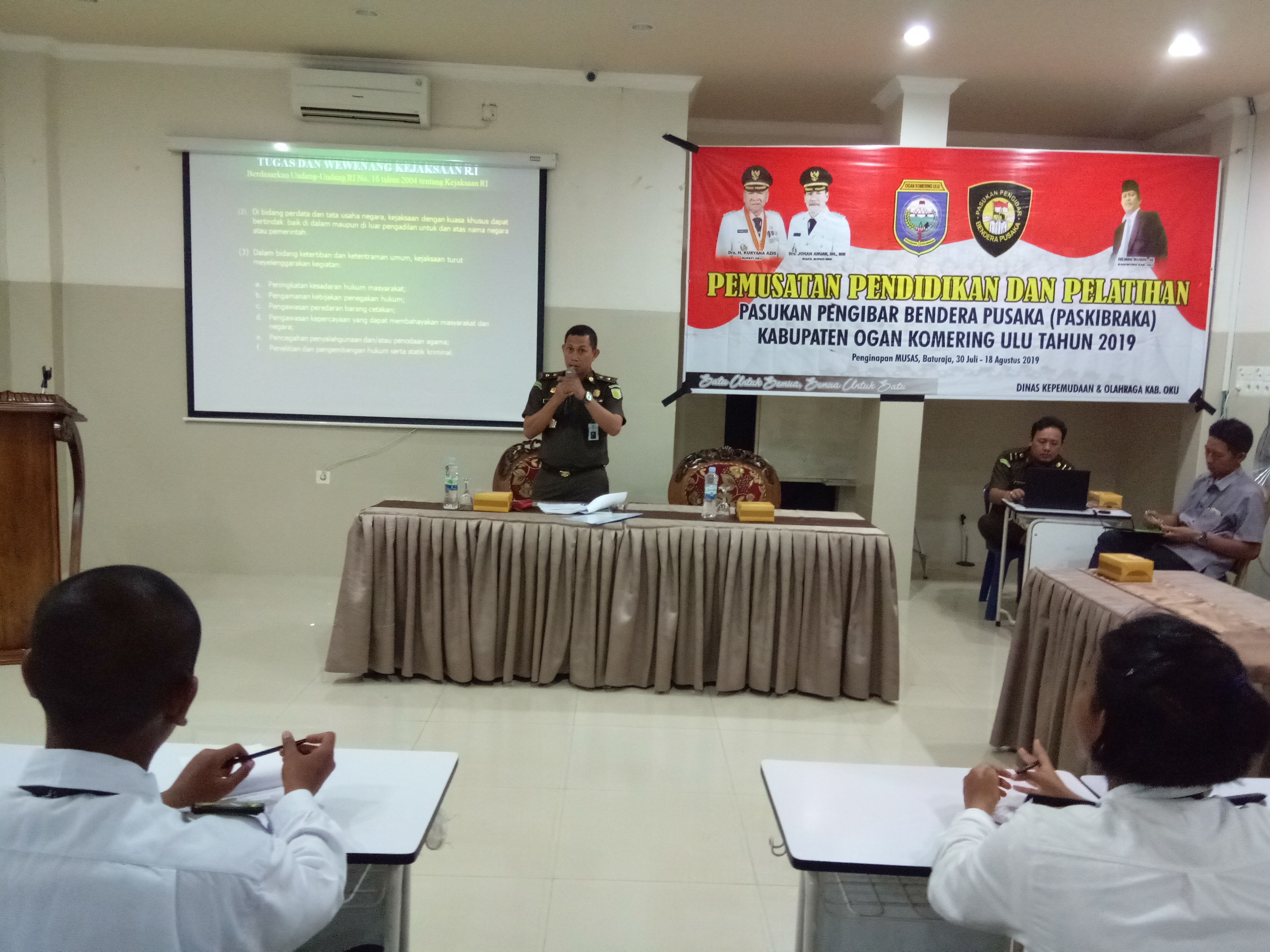 OKU, beritakite.com – Kepala Kejaksaan Negeri Ogan Komering Ulu (OKU) Bayu Paramesti, SH melalui Kepala Seksi Intelijen Abu Nawas, SH pada Rabu (31/07/2019) malam memberikan pembekalan kepada 53 orang Calon Anggota Pasukan Pengibar Bendera Pusaka (Capaska) Kabupaten OKU tahun 2019.