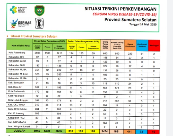 OKU, beritakite.com – Kasus konfirmasi positif Covid-19 kembali terjadi Kabupaten OKU, berdasarkan data yang dirilis Dinas Kesehatan Provinsi Sumsel, 14 Mei 2020 mencatat, pasien covid di OKU sebanyak 27 kasus. Padahal data 13 Mei, di OKU tercatat total 26 kasus.