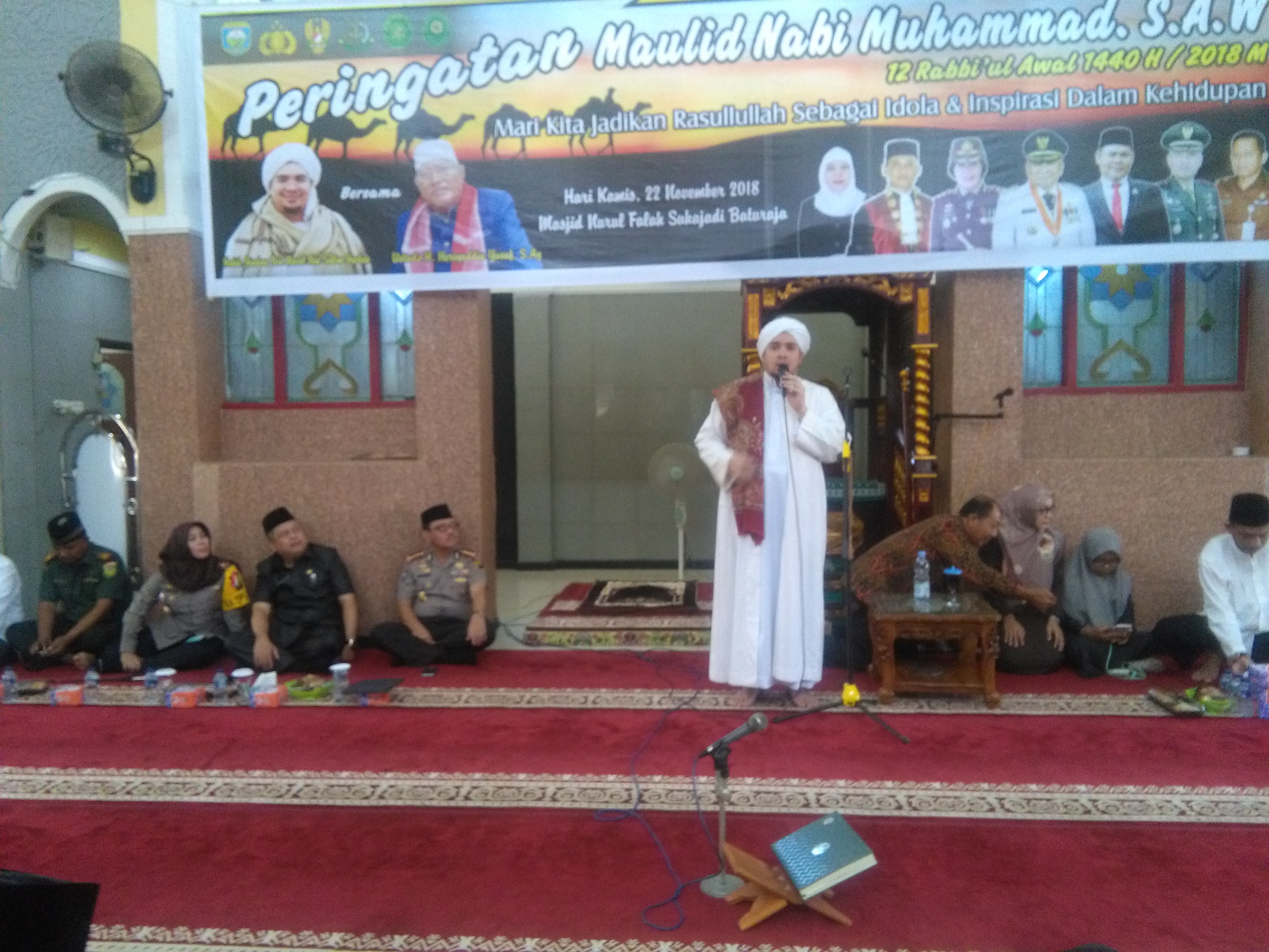 Peringatan Maulid Nabi kali ini mengambil tema, “Mari kita jadikan Rasullullah sebagai idola dan insiparasi kehidupan ini” menghadirkan Ulama kondang Habib Jindan Bin Novel Bin Salim Jindan bersama Ustadz Heriyuddin Yusuf S.Ag, hadir dalam kegiatan tersebut Sekda OKU Dr. Drs. H. Achmad Tarmizi, SE., MT., M.Si, Dir. Binmas Polda Sumsel Kombes Pol. M. Son’ani, Kapolres OKU AKBP. Dra. NK. Widayana Sulandari beserta unsur muspida Kab. OKU.