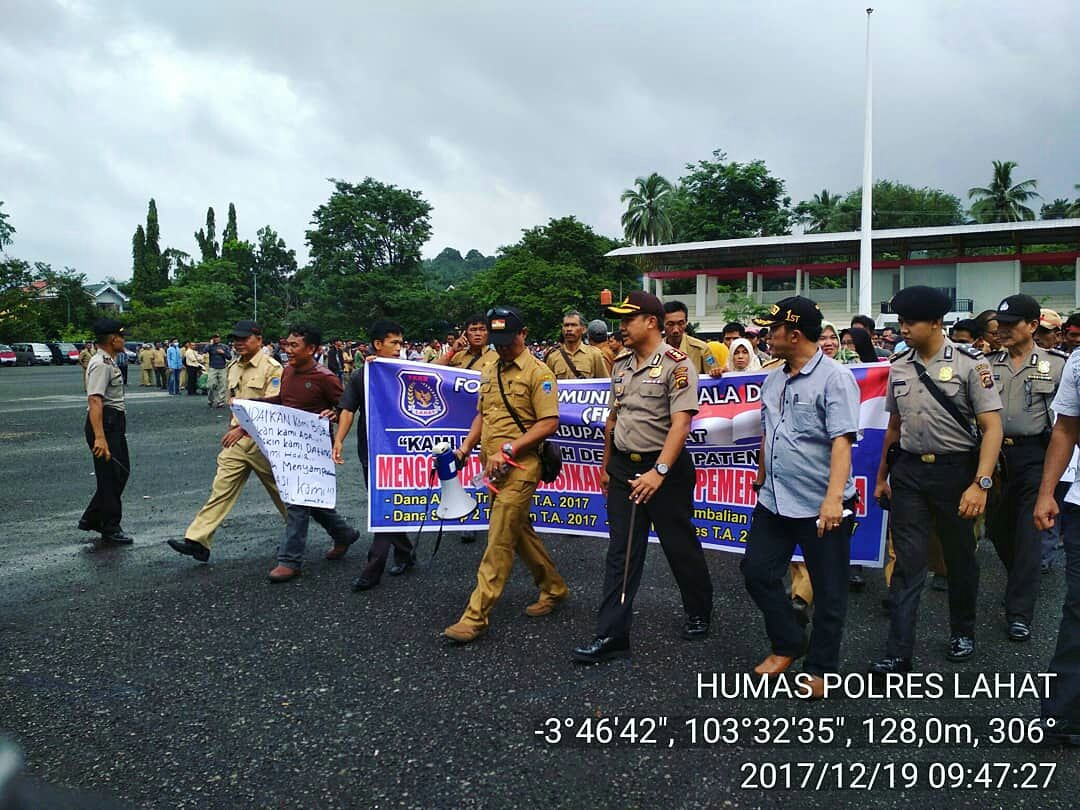Lahat, beritakite.com – Polres Lahat mengawal aksi dari ribuan peserta yang datang dari berbagai Desa Se-Kabupaten Lahat. (19/12) Demo ini diadakan di halaman kantor Pemerintah Kabupaten Lahat.