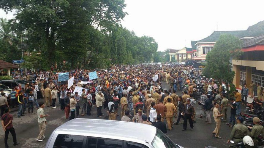 Lahat, beritakite.com – Ratusan orang yang tergabung dari Forum Komunikasi Kepala Desa (FKKD) dan perangkat desa menggelar unjuk rasa di depan kantor Pemkab Lahat, Sumatera Selatan. Mereka menuntut gaji yang sudah 6 bulan menunggak dan belum ada kejelasan.