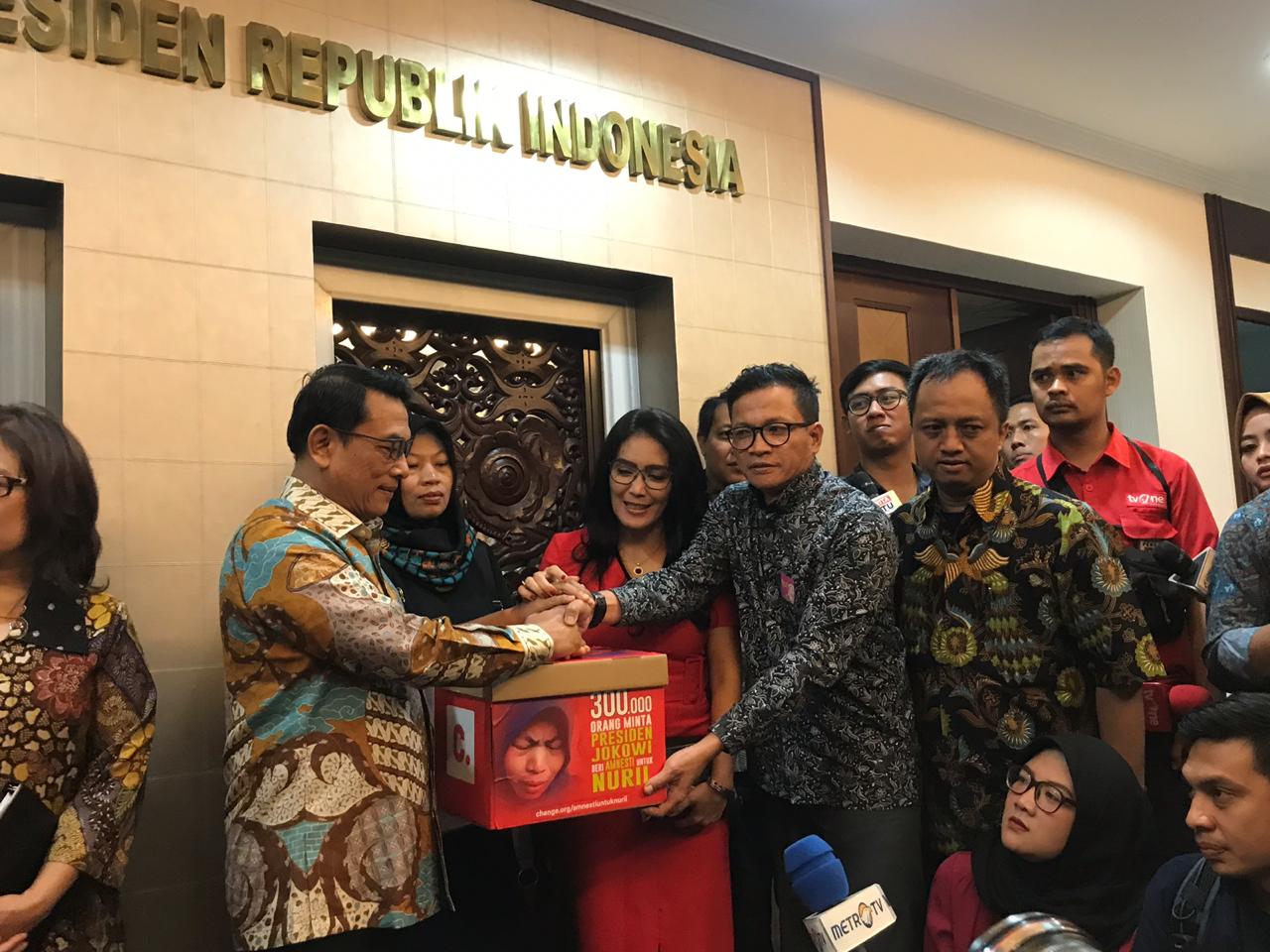 Kedatangan Baiq Nuril dan tim diakhiri dengan pembacaan surat dari Nuril kepada Presiden Jokowi di teras Bina Graha.